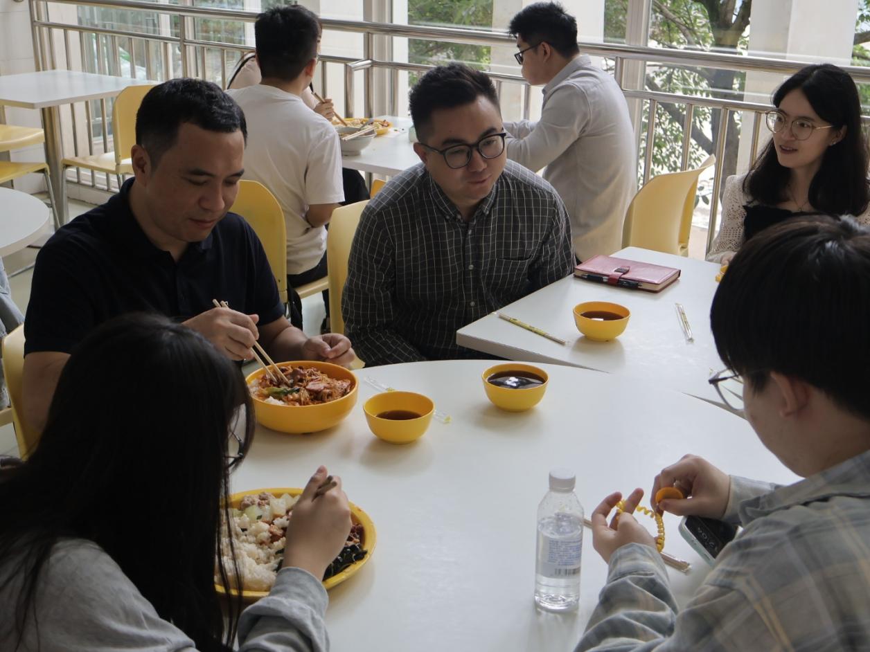 座谈会后,领导们前往504教室,后排观摩2023级本智能金融创新02班上课情况,通过观察课堂氛围、师生互动与学生专注度,掌握教学质量,课后还与授课老师交流教学进度和班级学习状态。中午,走访团队与学生代表在食堂共进午餐,在轻松氛围中继续倾听学子心声,了解校园生活细节与学习困惑。