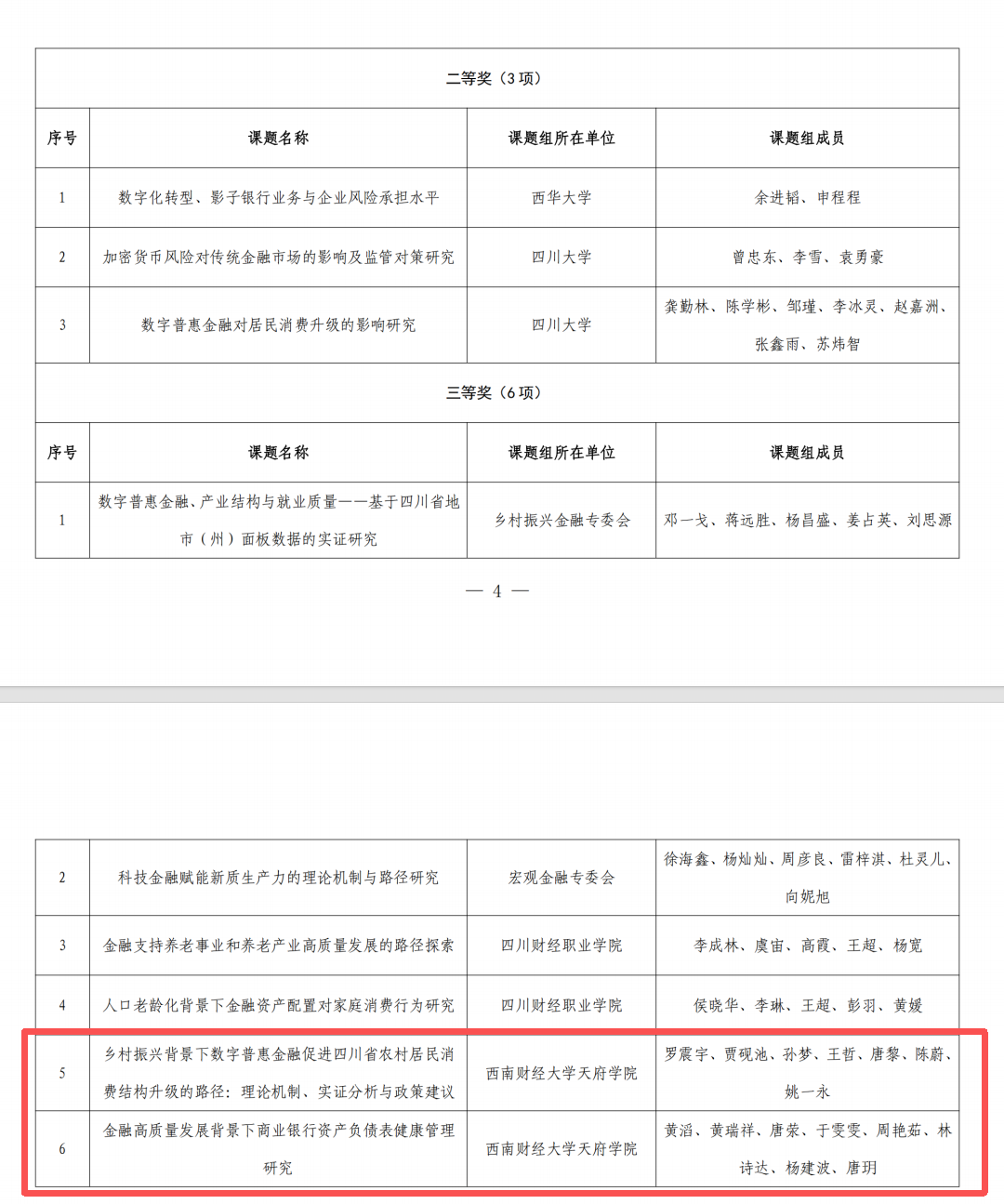 近日,四川省金融学会发布《关于公布2025年度重点研究课题获奖名单的通知》(川金学〔2026〕1号),公布了2025年度重点研究课题评审结果。经四川省金融学会专家评审委员会严格评审,我校智能金融学院金融系副主任罗震宇主持的《乡村振兴背景下数字普惠金融促进四川省农村居民消费结构升级的路径:理论机制、实证分析与政策建议》与经济系黄滔博士主持的《金融高质量发展背景下商业银行资产负债表健康管理研究》均在已立项的104项课题中荣获理论研究类三等奖。