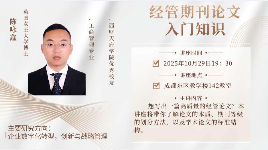 主讲人:陈咏鑫,男,英国女王大学工商管理博士毕业,西财天府学院2015级优秀校友,主要研究方向为企业数字化转型,创新与战略管理,论文发表于Technovation、Business Strategy and the Environment 等国际高水平期刊。