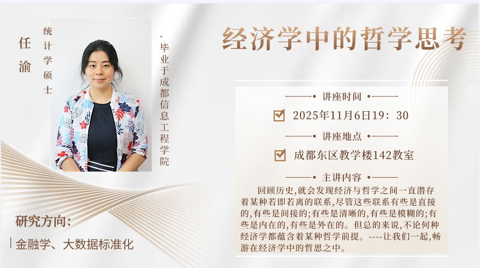 主讲人:任渝,女,统计学硕士,毕业于成都信息工程学院,2013年在西南财经大学金融中心进行了全脱产博士学习。研究方向:金融学,大数据标准化。