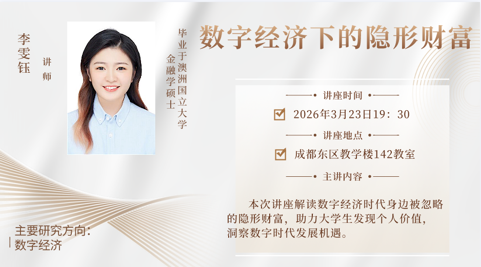 (第90期)数字经济下的隐形财富(预告)内容简介:本次讲座解读数字经济时代身边被忽略的隐形财富,助力大学生发现个人价值,洞察数字时代发展机遇。主讲人:李雯钰,女,讲师,毕业于澳洲国立大学,金融学硕士,主要研究方向:数字经济。题目:《穿透数字读财报-股票投资基本面分析》时间: 2026年3月23日 (星期一) 19:30-21:00讲座地点:成都东区教学楼 ...